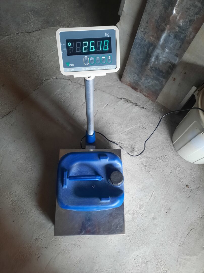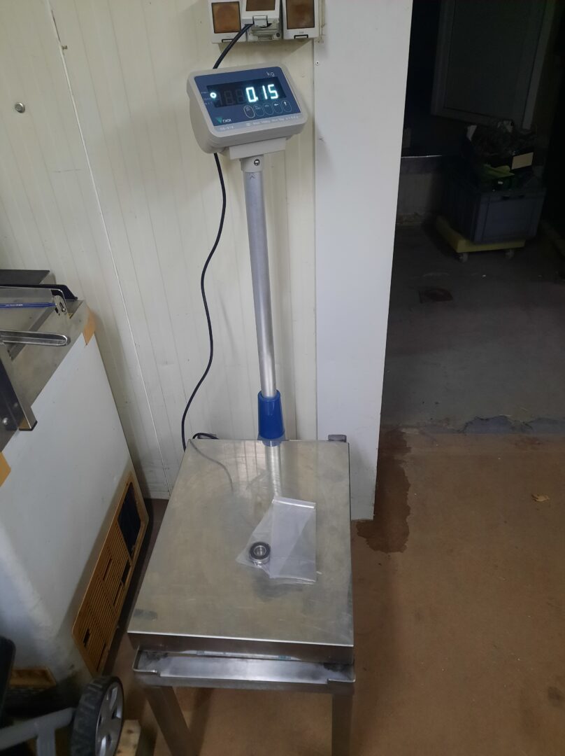 Cantar electronic cu capacitate maxima de 150 kg, minim 1 kg, tara=150 kg, eroare 50 g, dimensiuni platan de 52×41 cm.