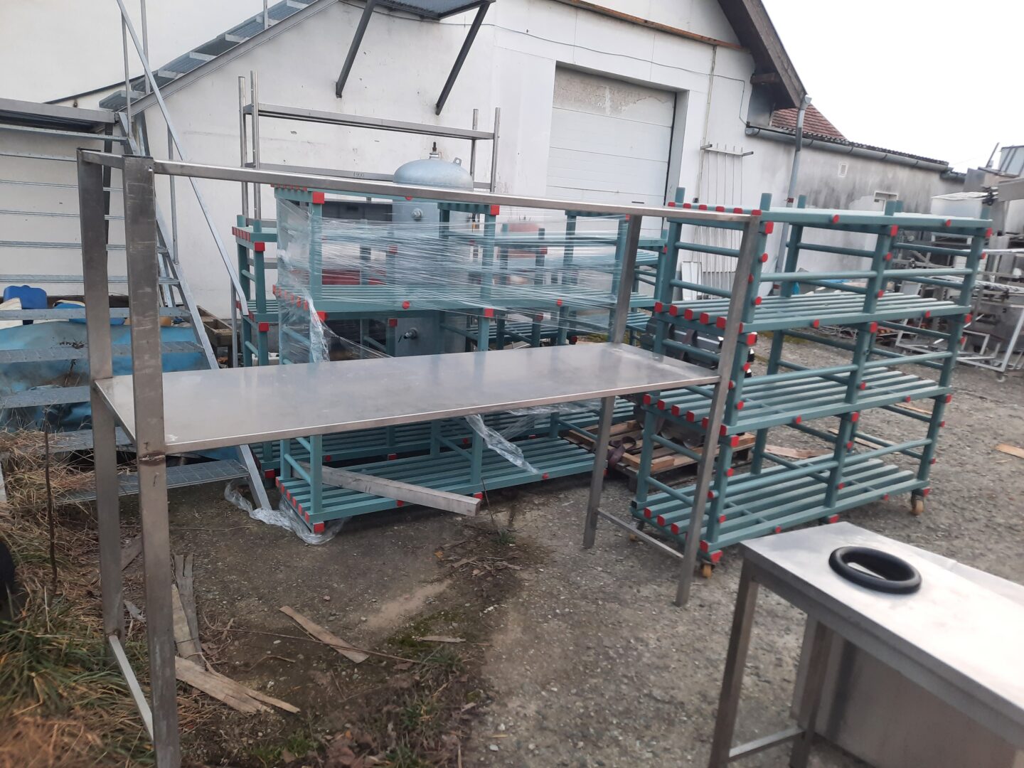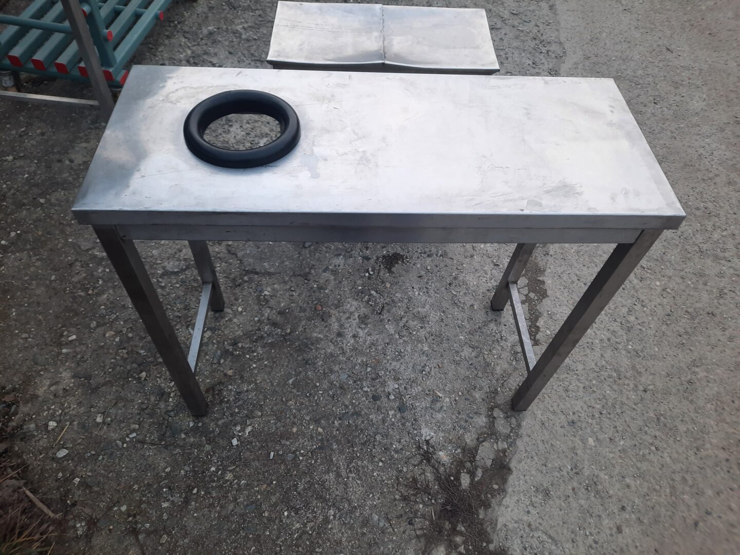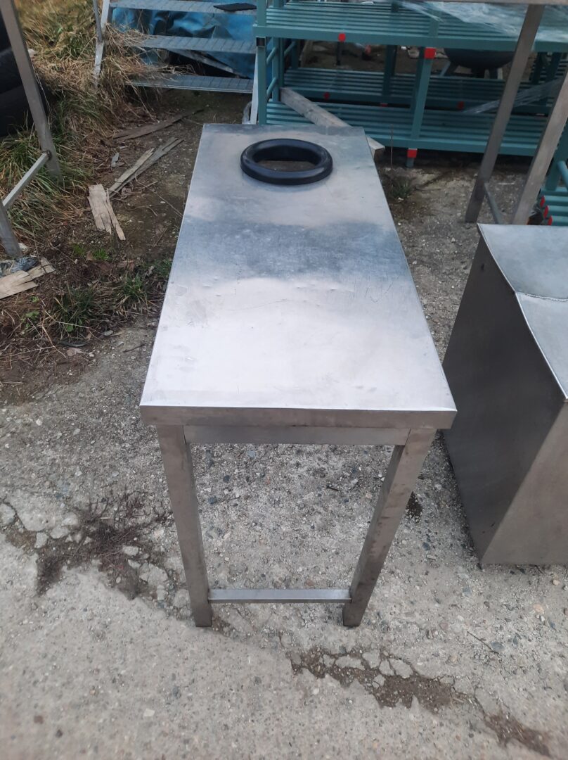Masa din inox cu decupare circulara de 16 cm, dimensiuni blat de 110×45 cm, inaltime de 92 cm.