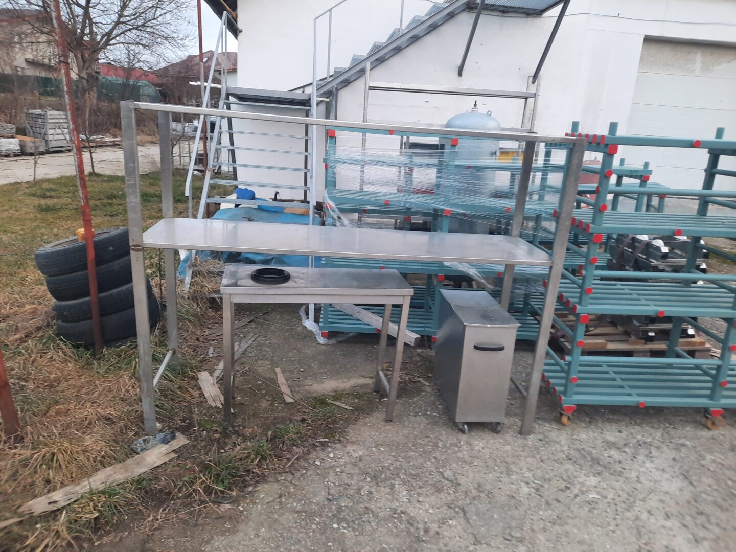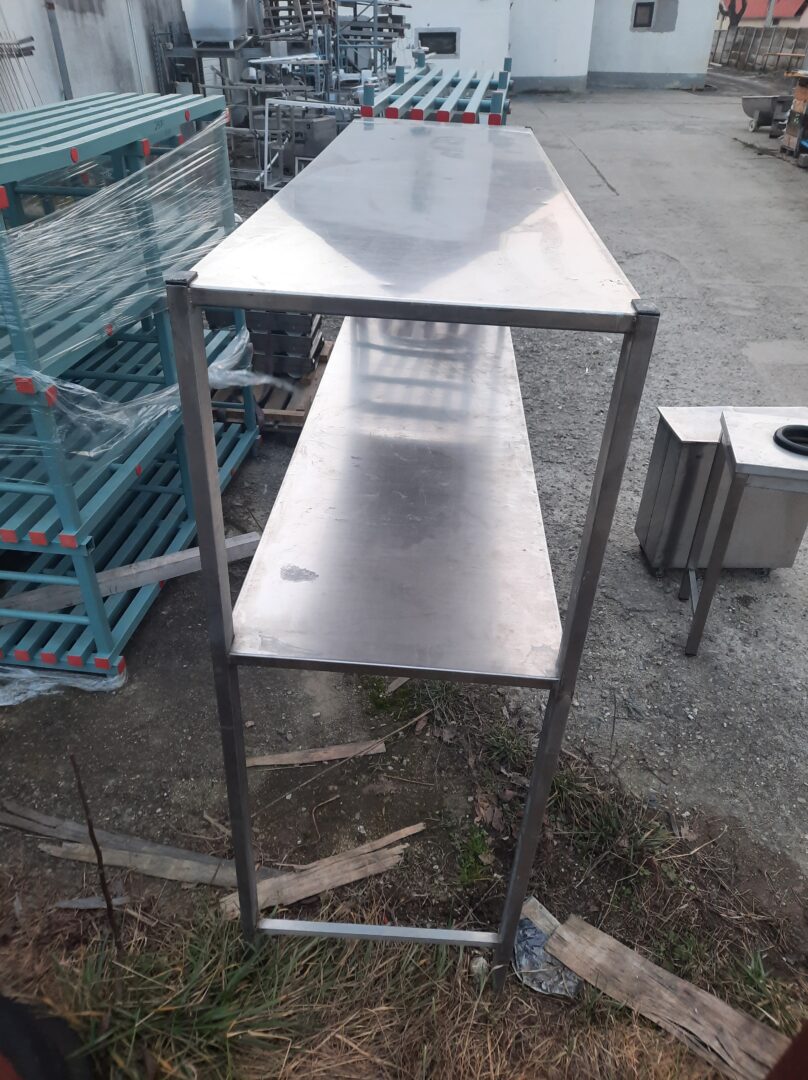 Raft din inox cu 2 polite, dimensiuni polite de 233×68 cm, inaltime 181 cm.